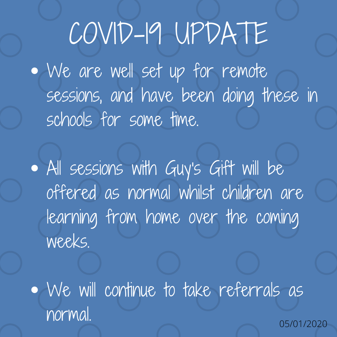 Last summer, we trialed on-line counselling and support. The team upskilled and put into practice working in new and (for Guy’s Gift) unchartered ways. This has been a huge success for Guy’s Gift, and we have been able to continue providing 1:1 counselling and support for bereaved children and young people across Coventry and Warwickshire.
